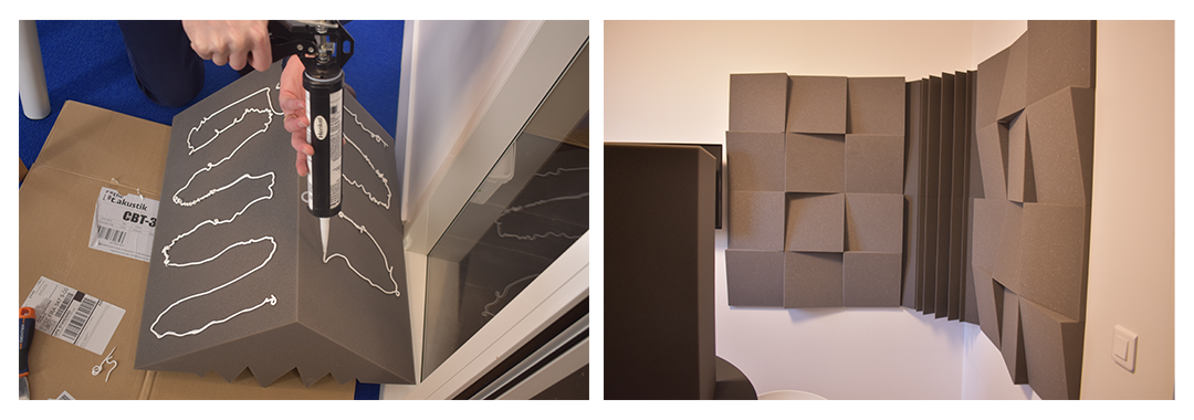 While we waited for our table to dry, we began working on the acoustic treatment of the room. Teddy, our studio expert, analysed the room and decided that we’d need to put some acoustic mousse on the walls to help absorb the reverb. We simply used a special glue, adapted for this purpose, to put it up on the wall.