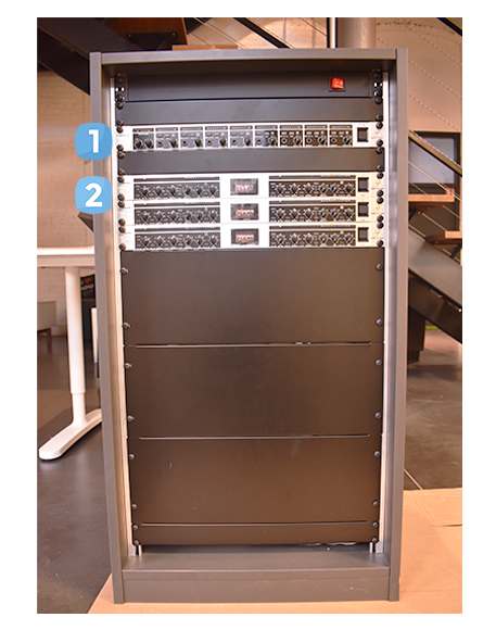 The top part of the rack (1) corresponds to our headphones amplifier. The bottom of the rack (2) corresponds to our microphone amplifier.