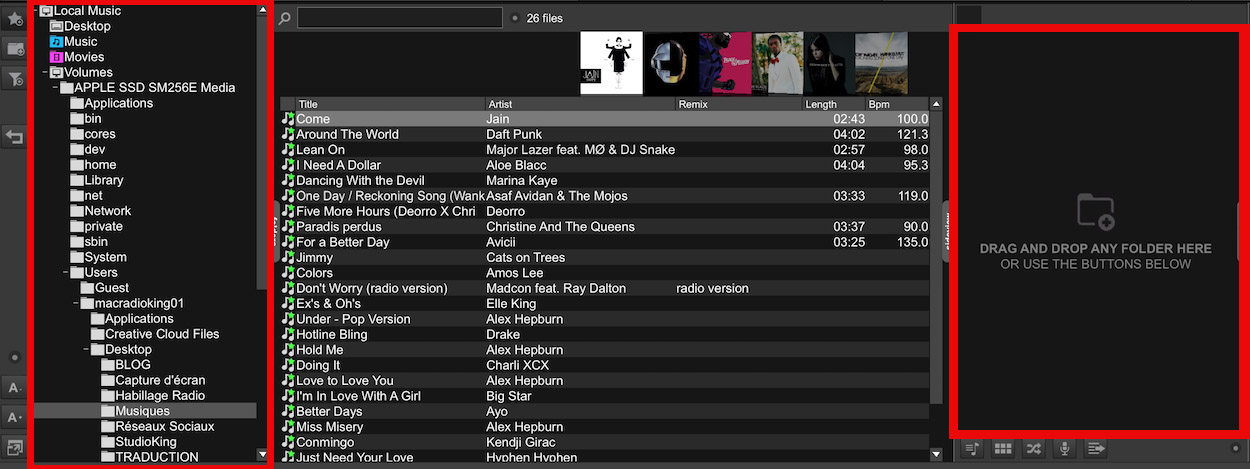 Now that you’re ready to broadcast, let’s take a look at how to manage your tracks. There are two possible solutions. You can either choose one of your tracks directly linked to your Desktop on the left-hand side of your screen. Or, you can drag and drop your folder into the box on the right-hand side if your tracks are on an external hard drive.