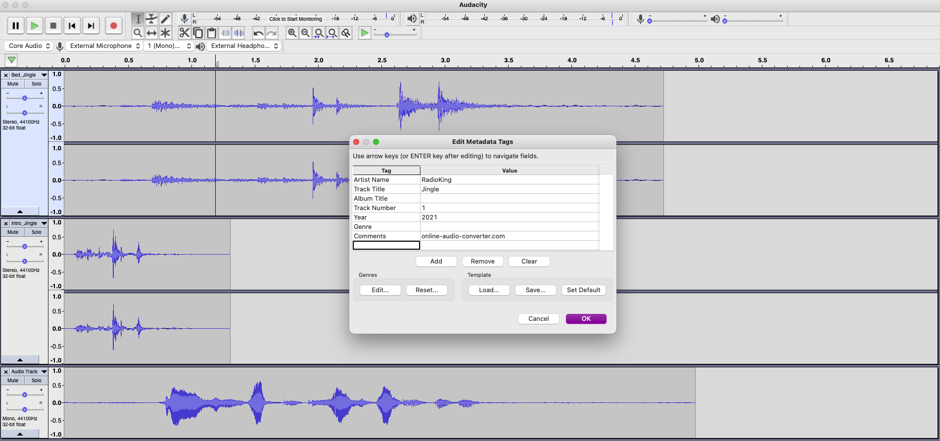 In order for your audio files to be read by Manager Radio, you’ll need to export them to MP3. To do so, click on File > Export > Export as MP3.