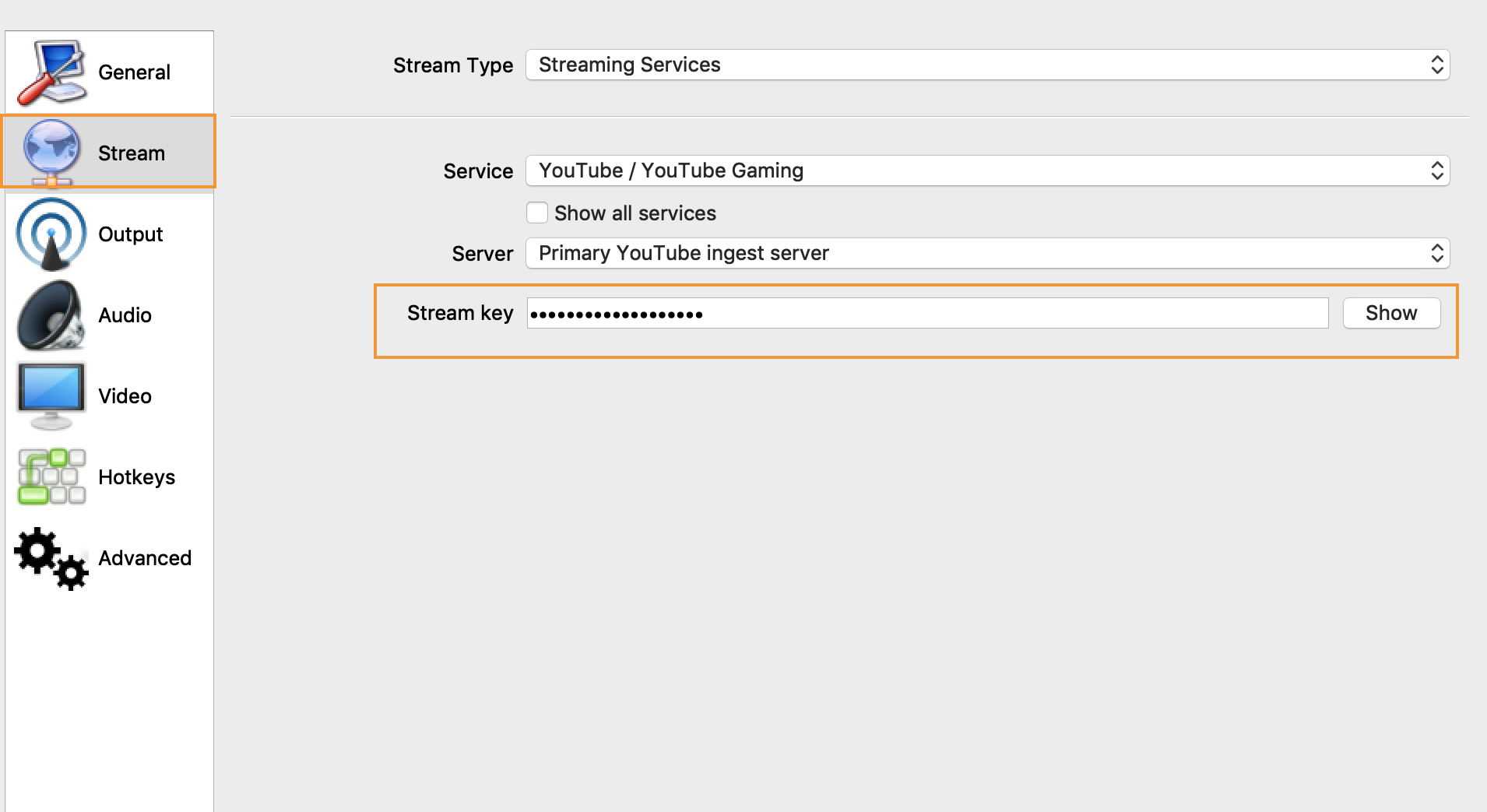 You’ll then have access to your Stream URL as well as a Stream Key (the part that we’ll need). Head back over to OBS and enter your stream key.