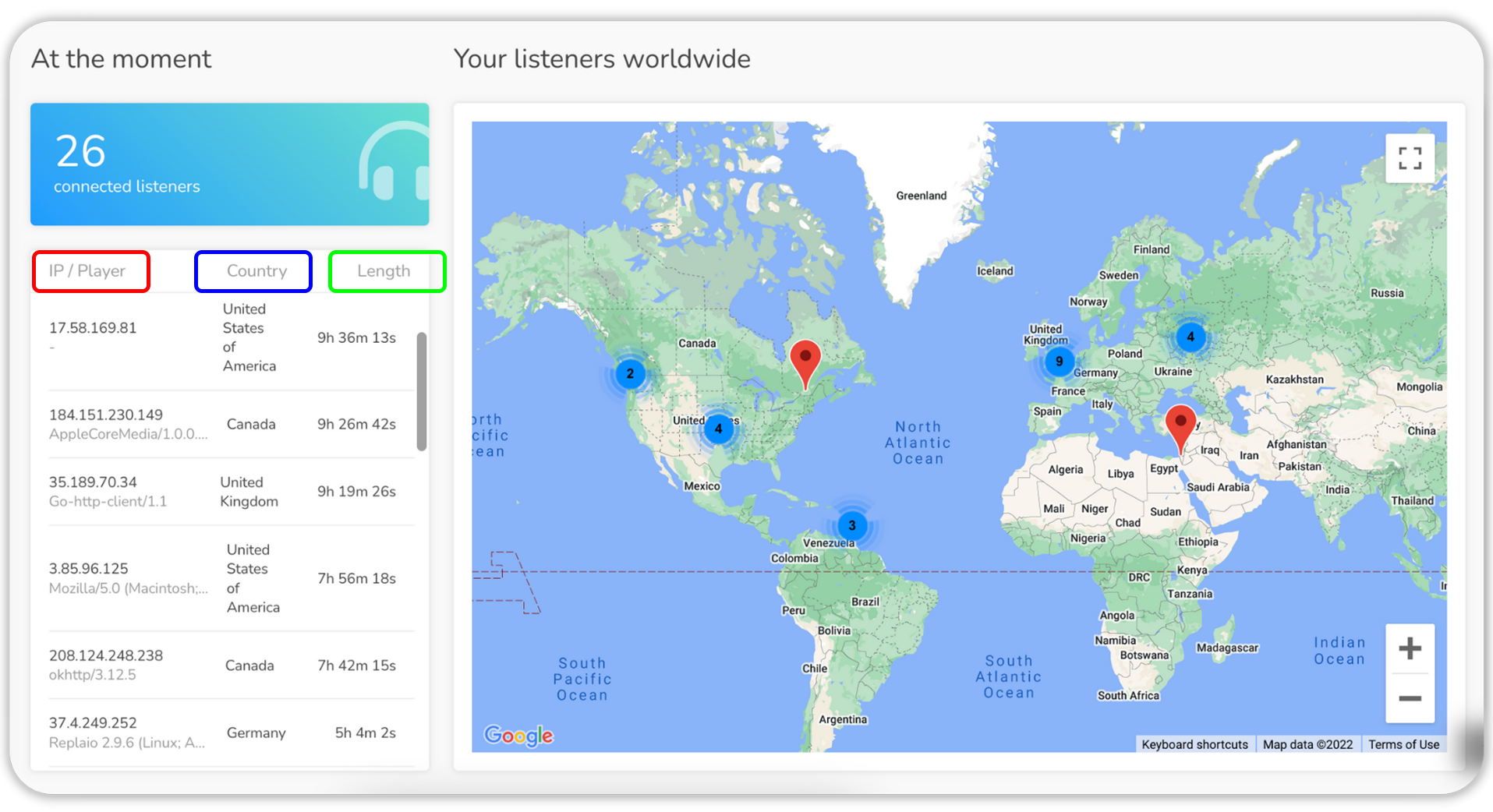 This first tab gives you information regarding your current listeners. You’ll easily be able to see the number people who are listening to your radio station in real time. The table on the left-hand side will give you details such as: