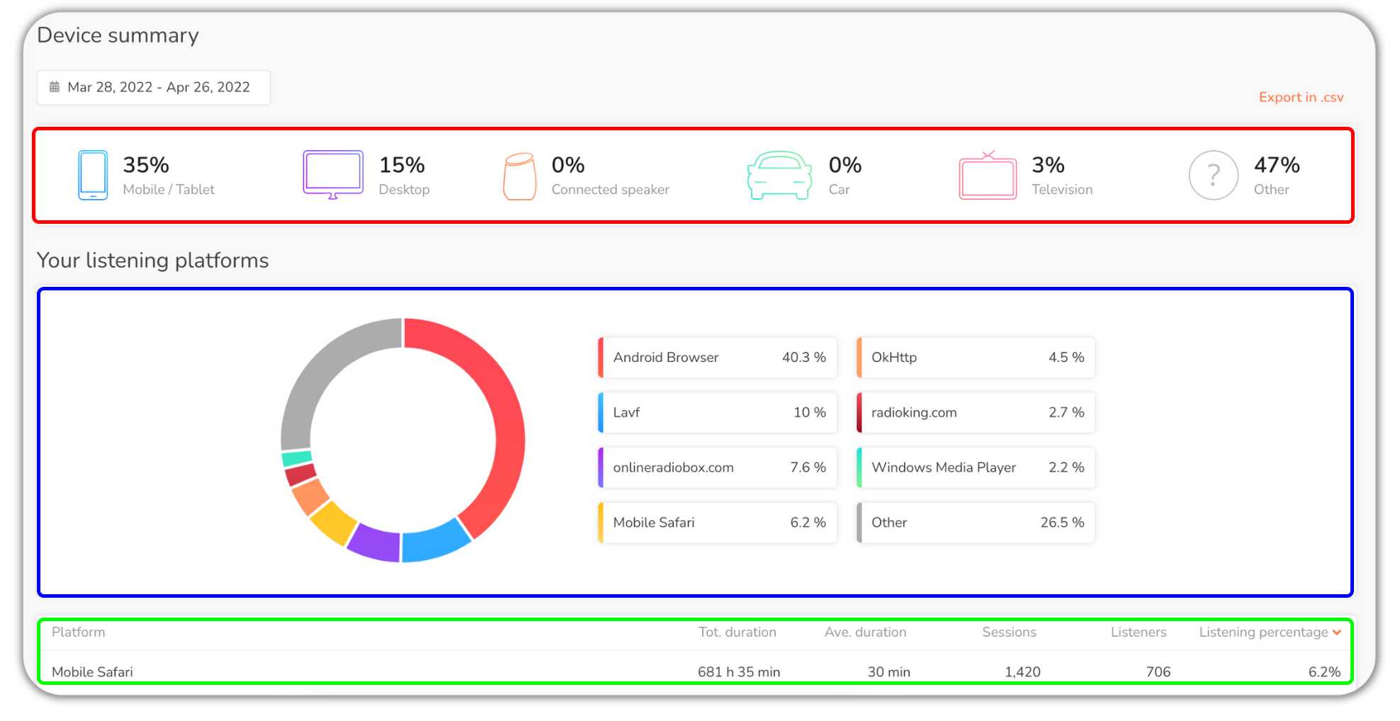 3: A complete list of all the platforms used to listen to your radio, with the total and average duration of sessions, the number of sessions, the number of listeners and the share of listening for each.