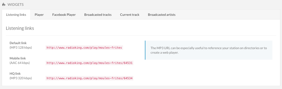 Once your various streams are activated, find the listening links under the “Listening Links” tab in the “Widgets” section.